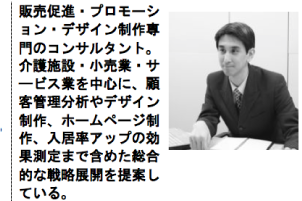 | 2003年 | コンサルティング会社 入社 その後、友人とともに起業し、販売促進コンサルティングを中心業務に据えた企業をスタートさせる。取締役として、販売促進コンサルティング、顧客管理分析を行う。 |